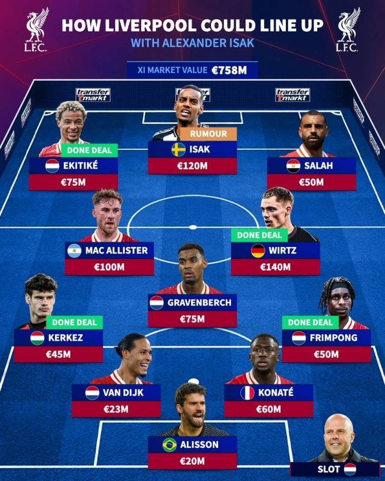 英超大结局?德转预测签伊萨克后的红军主力阵:索博&加克波替补 admin 2025年07月24日 21:30 46 0 直播吧7月24日讯 利物浦刚刚官宣埃基蒂克,而多方消息确认,伊萨克已经告知纽卡希望离队,《转会市场》也据此预测了红军新赛季主力阵容。德转列利物浦新赛季主力阵:总身价7.58亿欧元前锋:埃基蒂克(7500万)、伊萨克(纽卡,1.2亿)、萨拉赫(5000万)中场:麦卡利斯特(1亿)、赫拉芬贝赫(7500万)、维尔茨(1.4亿)后卫:科尔克兹(4500万)、范迪克(2300万)、科纳特(6000万)、弗林蓬(5000万)门将:阿利森(2000万) 标签: #伊萨克 #利物浦 #预测 #索博 #范迪克 #赛季 #纽卡 #& #amp #埃基蒂克 #主力阵